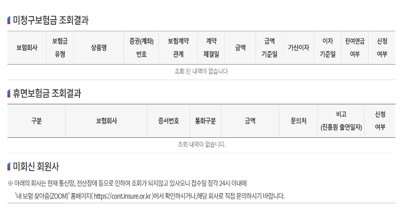 미청구 보험금. 보험가입내역 조회결과 화면에서 화면을 조금만 더 내리면 위와 같은 화면이 나옵니다. 위 화면은 혹시 여러분이 지금 당장 받을 수 있는 보험금이 있는데 찾지 않았다면 나오게되는 화면입니다. 저는 다행이 없지만, 어른들 같은 경우 만기가 다 되어 찾을 수 있는 보험금이 있을 수도 있겠습니다.