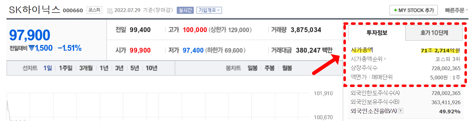 SK하이닉스 시가총액입니다. 네이버 등 포털사이트에 기업 검색 후 결과화면에서 네이버 금융 주가가 표시된 곳을 클릭하시면 이와 같은 화면을 찾을 수 있습니다. 오른쪽 시가총액 정보를 확인할 수 있습니다.