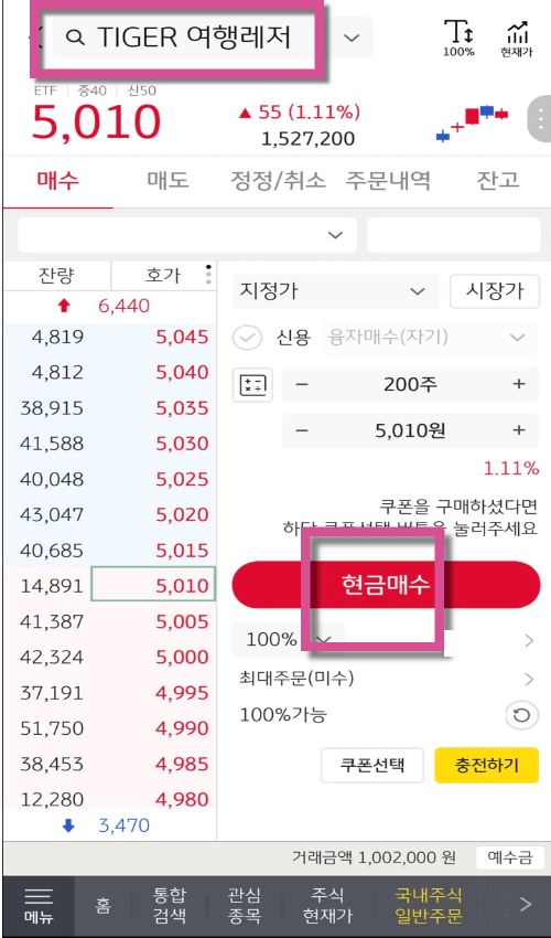 주식을 매수하는 것과 동일합니다. 다만 ETF는 수 많은 종목을 담고 있기 때문에 해당 ETF가 어느 컨셉을 잡고 투자하는지 잘 분석해야 합니다. 저는 TIGER 여행레저를 매수하였습니다. 보시는 예시는 지극히 개인적인 분석 아래 투자하였을 뿐 실제 여러분의 투자는 여러분 자신의 분석과 책임으로 투자하시길 바랍니다.